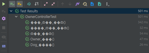 | 인텔리j에서 메소드명을 한글로 하면 간혹 깨질때가 있는데 인코딩문제로 인코딩을 해결하면 한글로 잘 나온다.
