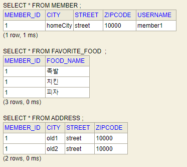 Embedded로 설정된 Address는 member에 소속된 값타입이기 때문에 함께 조회됩니다.