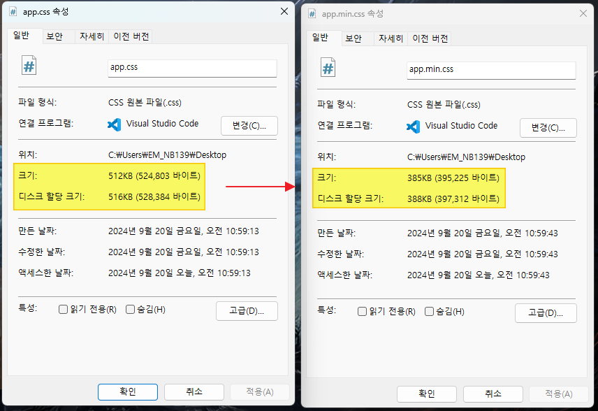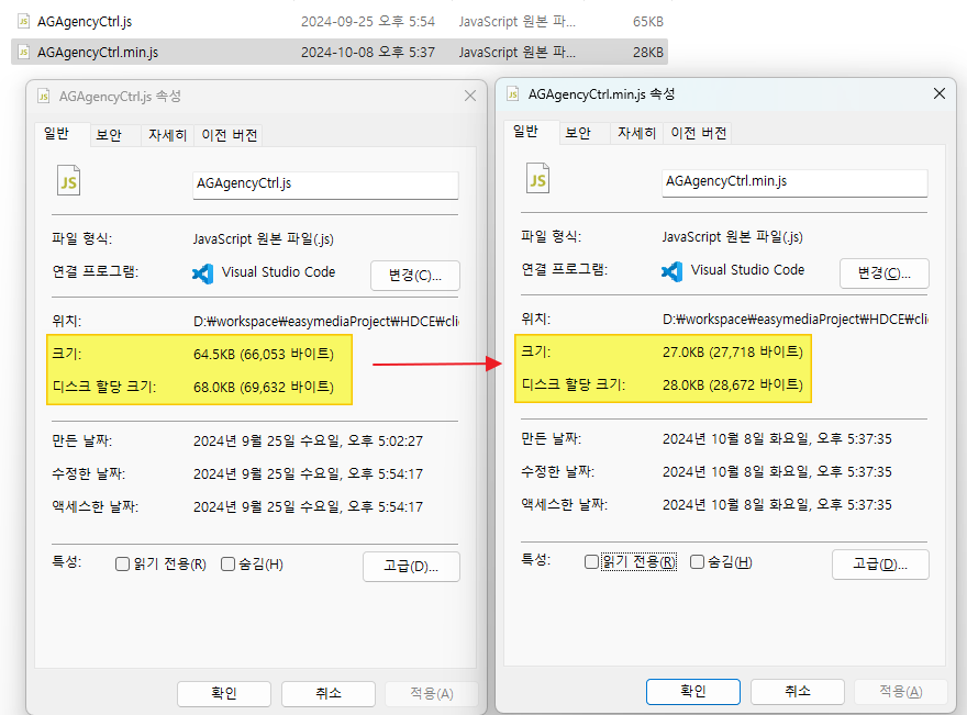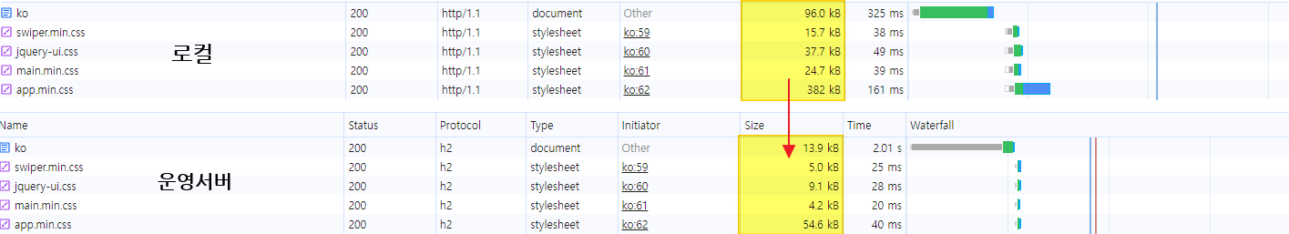 gzip을 적용한 전/후인데요. 용량이 엄청 줄어든것을 확인했습니다.